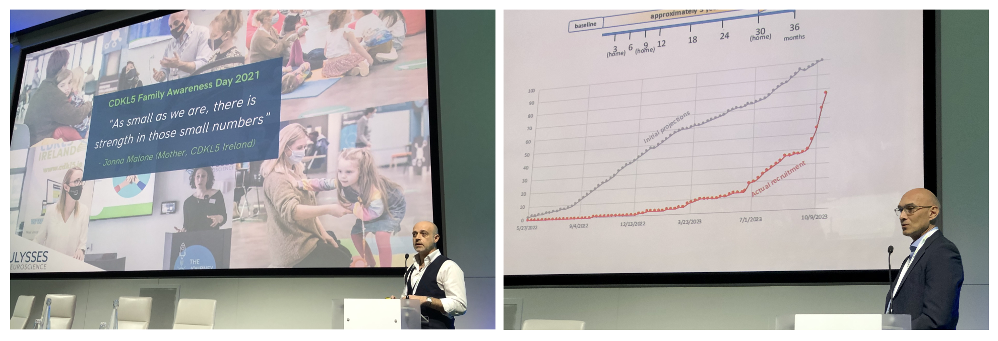 Ensuite, le Dr Xavier Liogier, de la Loulou Foundation, nous a informé des progrès de l’étude CANDID, menée en collaboration avec un consortium d’entreprises développant des traitements pour le CDD. Cette étude évalue des échelles cliniques bien connues qui ont déjà été utilisées dans des essais cliniques pour d’autres maladies, pour voir comment elles pourraient s’appliquer au CDD. L’année dernière, Xavier nous a parlé du premier patient inscrit. Douze mois plus tard, il nous a informés que nous aurons plus de 100 participants d’ici la fin de cette année et nous a montré beaucoup de données sur la manière dont ces échelles sont capables de capturer différents symptômes du CDD. Le graphique de recrutement semblait exponentiel, montrant une fois de plus la mobilisation extraordinaire de la communauté des patients pour rendre l’étude CANDID possible.