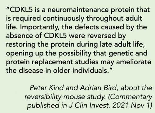 La médecine translationnelle fait référence au pont entre le traitement des souris et le traitement des personnes. Il cherche à répondre à des questions telles que : « comment saurons-nous que nous avons augmenté la protéine CDKL5 dans le cerveau ? », « comment saurons-nous si nous améliorons la fonction synaptique ? » et « comment allons-nous mesurer les améliorations chez les patients de l’essai ? ».