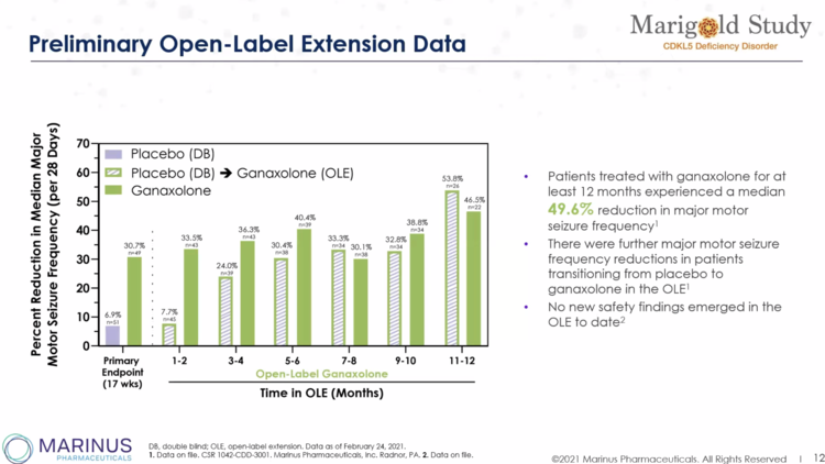 Ce que j’ai trouvé vraiment passionnant dans la présentation de Marinus, ce sont les données de leurs études, où ils ont montré comment se débrouillaient les patients des essais de phase 3. Puisqu’elle est ouvertement disponible sur leur site Web et non confidentielle, je vais copier leur diapositive ici car les données ont l’air vraiment bonnes et elles sont mieux vues dans le graphique :